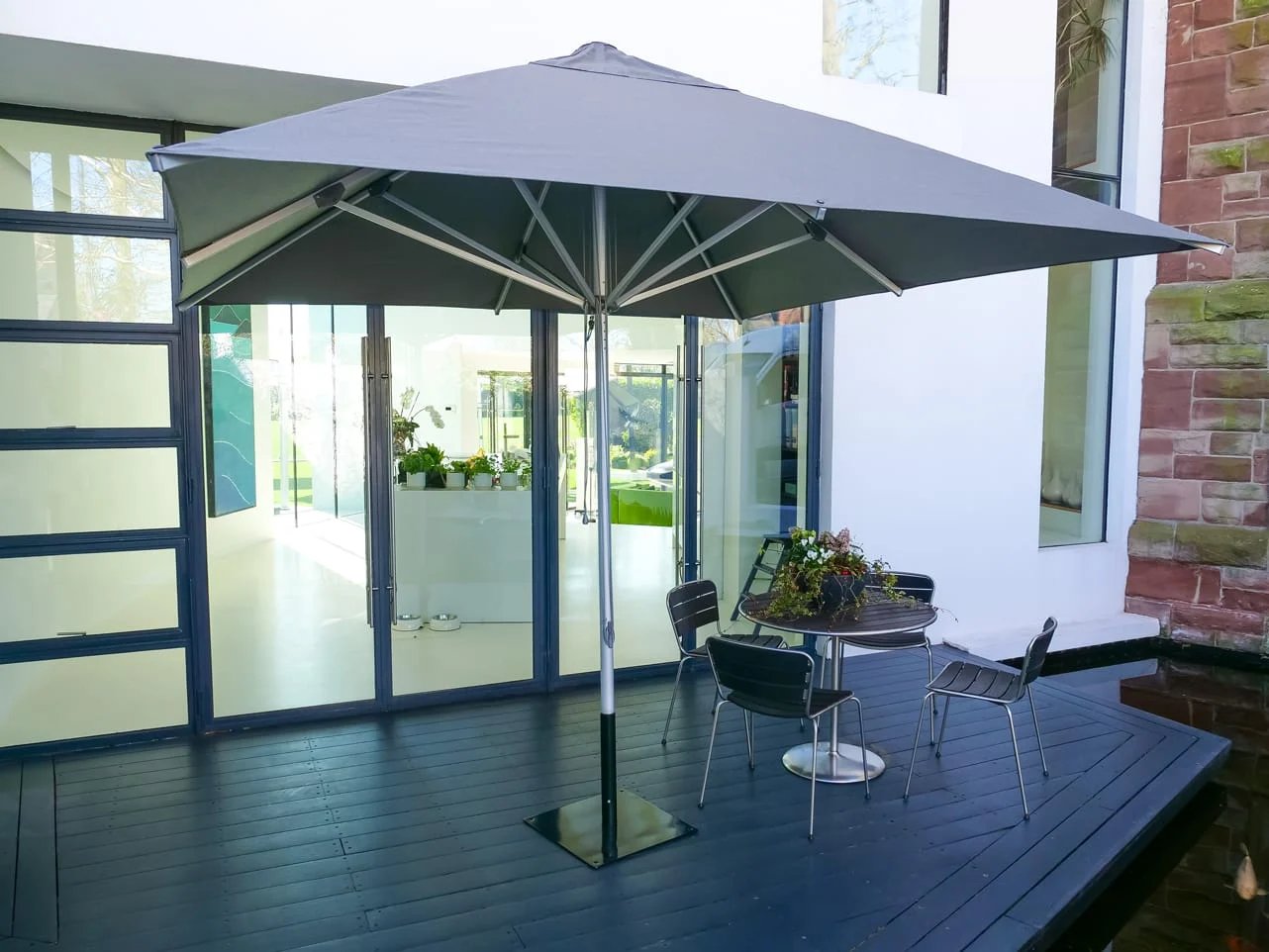 The parasol is available in multiple sizes to suit your exact requirements, and comes with a choice of base options including steel, galvanised, concrete, in-ground, or wheeled bases. It is ideal for permanent or portable setups, with professional installation services available across the UK and Europe.