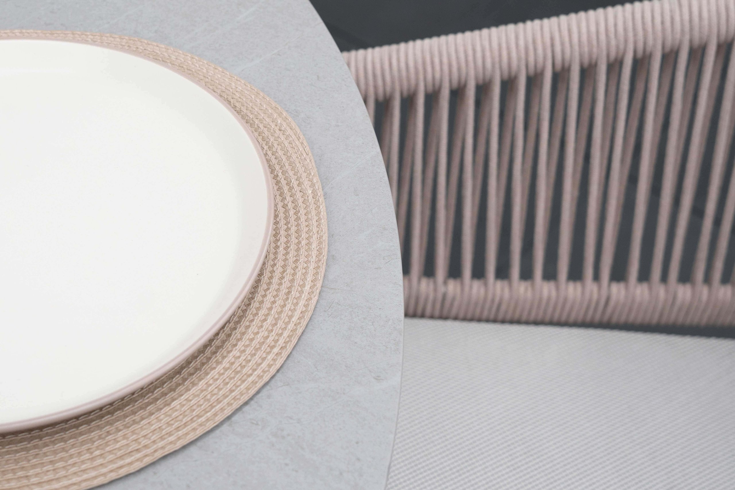 Paired with the muted chalk grey frame, the blush tones form a stunning color palette that enhances any garden style, from contemporary outdoor rooms to traditional cottage gardens. This thoughtful color combination ensures the dining set will complement your existing outdoor decor while adding a distinctive touch of elegance that makes every gathering feel truly special and memorable.