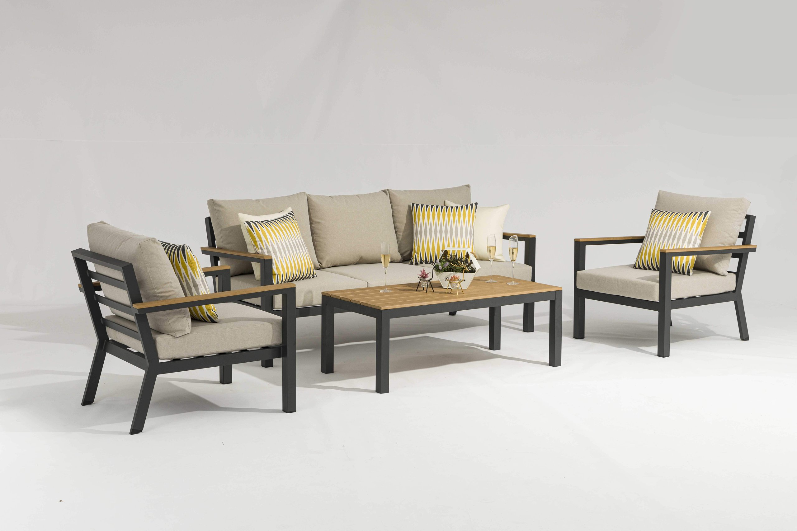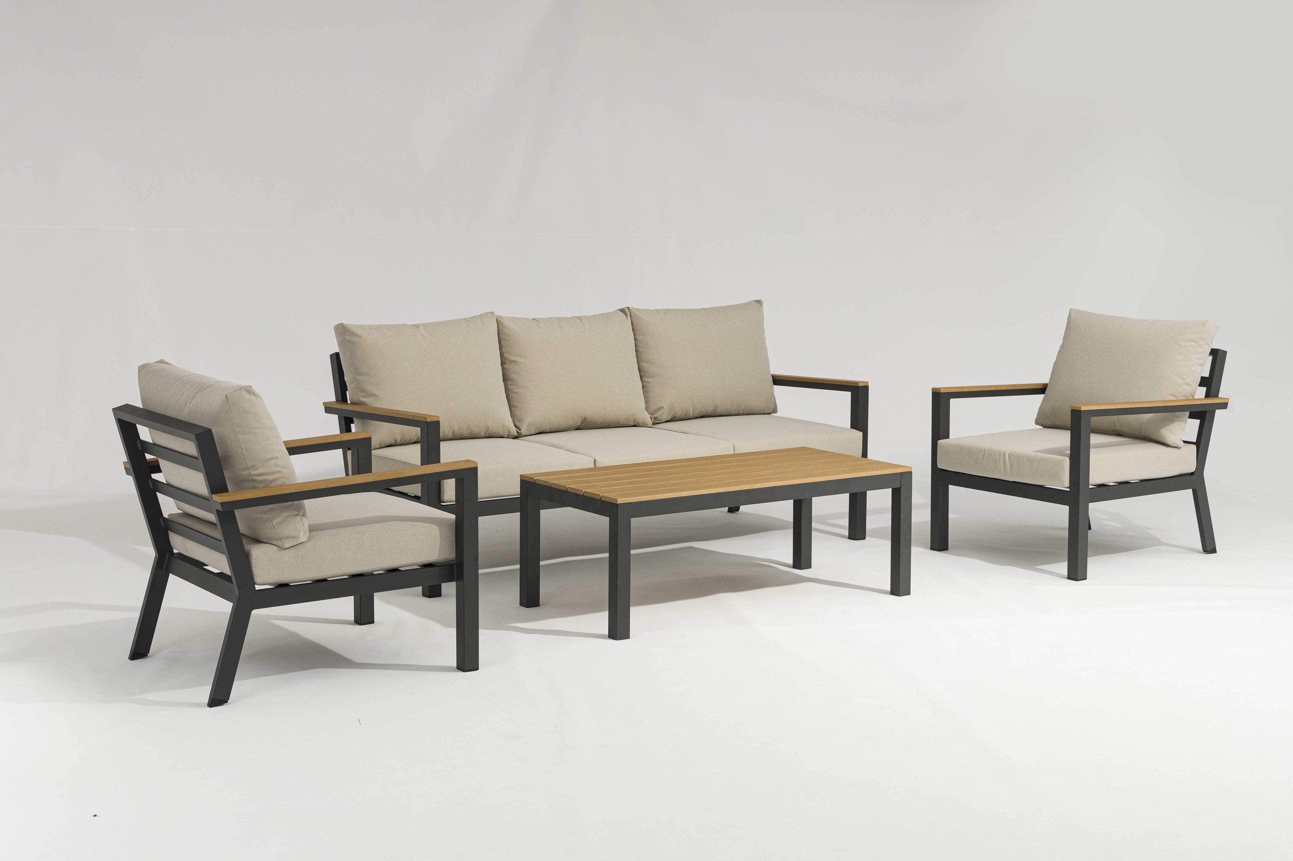 Complementing the polywood, the cushions are crafted from GRS-certified eco fabric, combining comfort with sustainability. The innovative Velcro straps underneath each cushion ensure they stay securely in place, even during breezy summer days adding to the overall look. The collection’s sleek powder-coated aluminium framework adds a touch of elegance while providing a sturdy, rust-resistant structure.