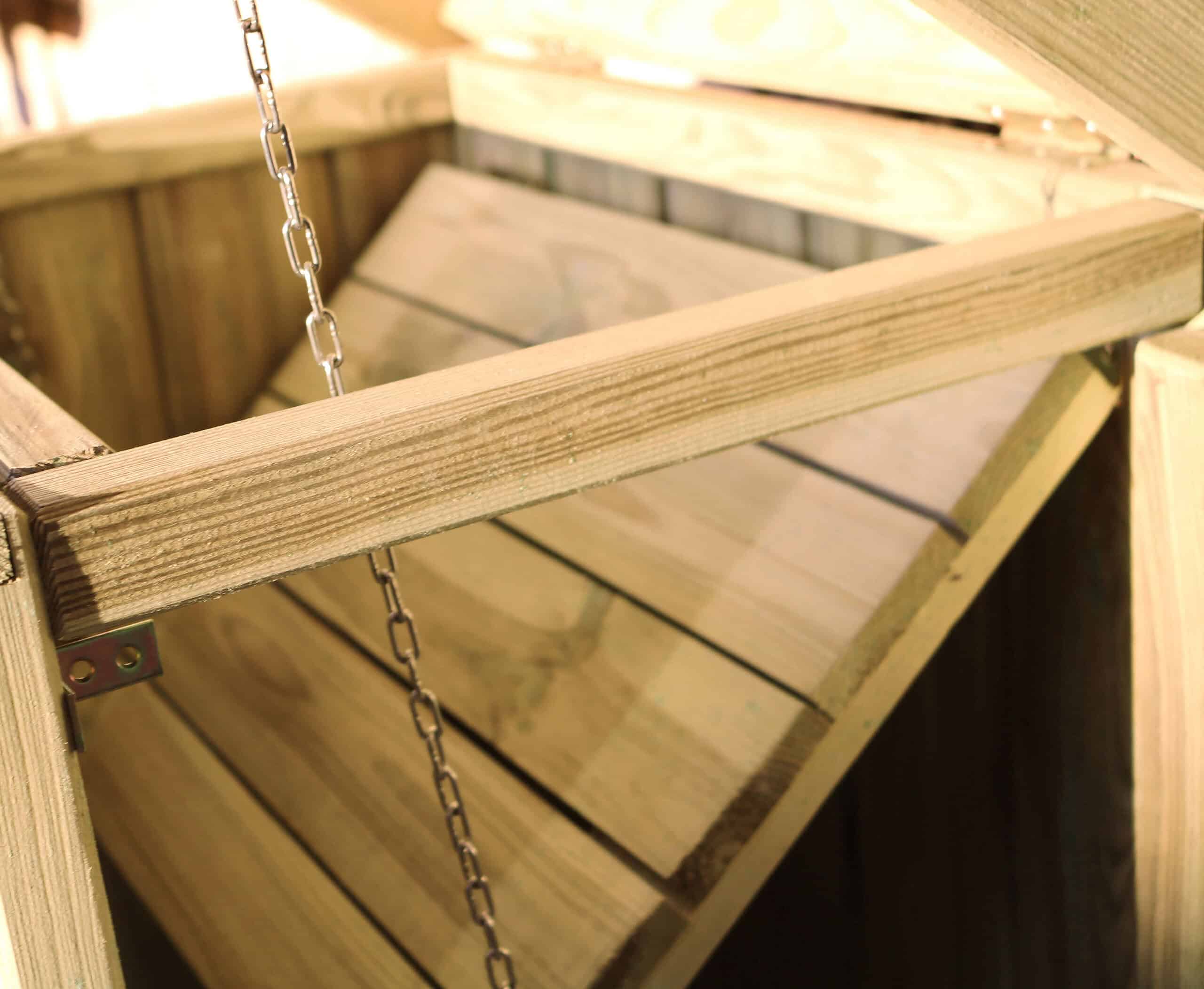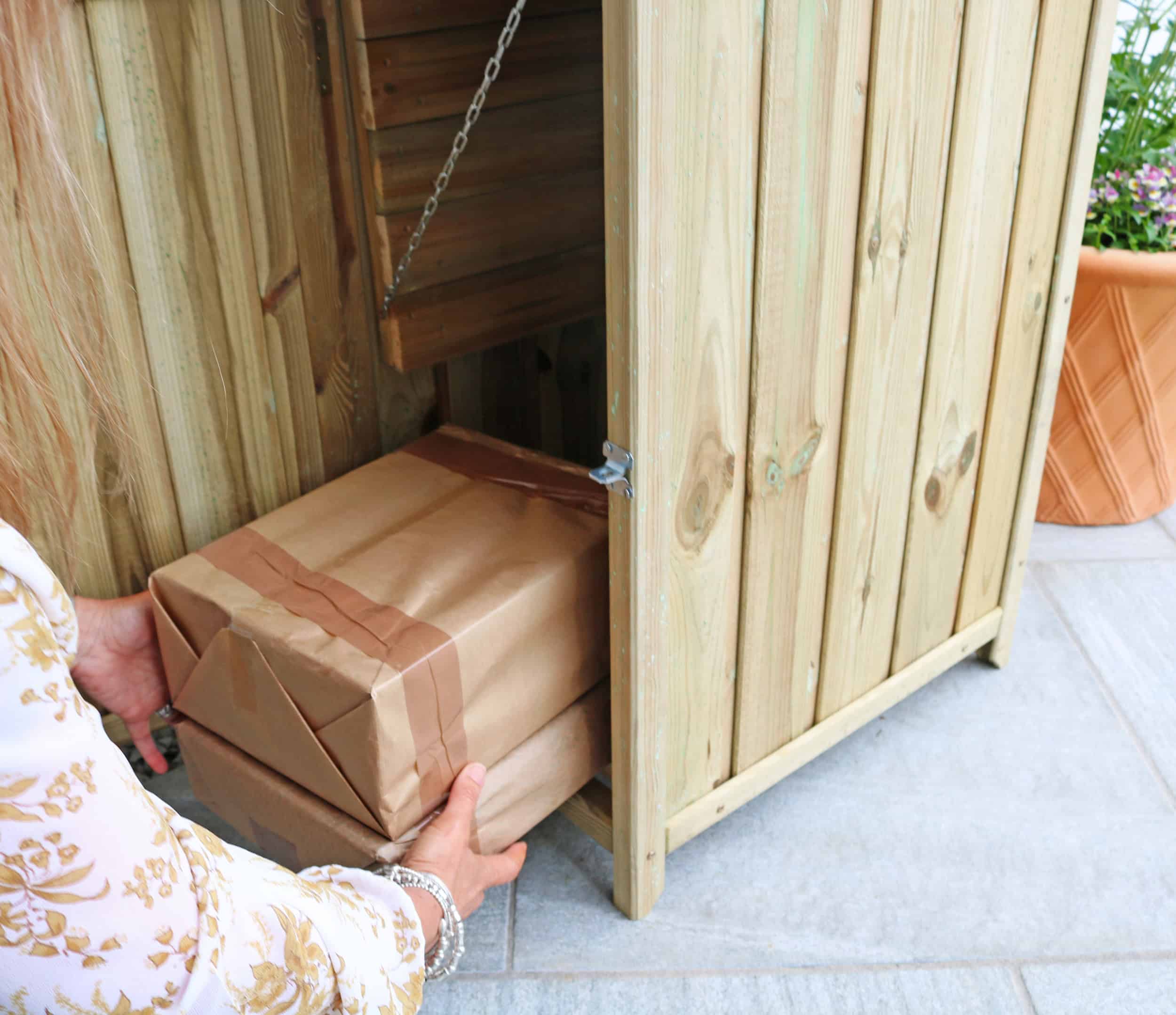 This innovative parcel store is made from sustainable, slow-grown softwood from responsibly managed forests. The pressure-treated timber ensures a durable and long-lasting product that comes with a 10-year guarantee against rot. Its clever design and robust construction make it a perfect solution for safely and discreetly storing parcels of all shapes and sizes. [Image of a secure parcel box with a lid and side door]
