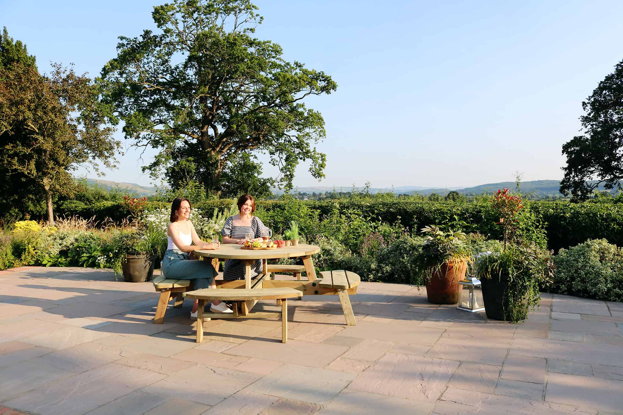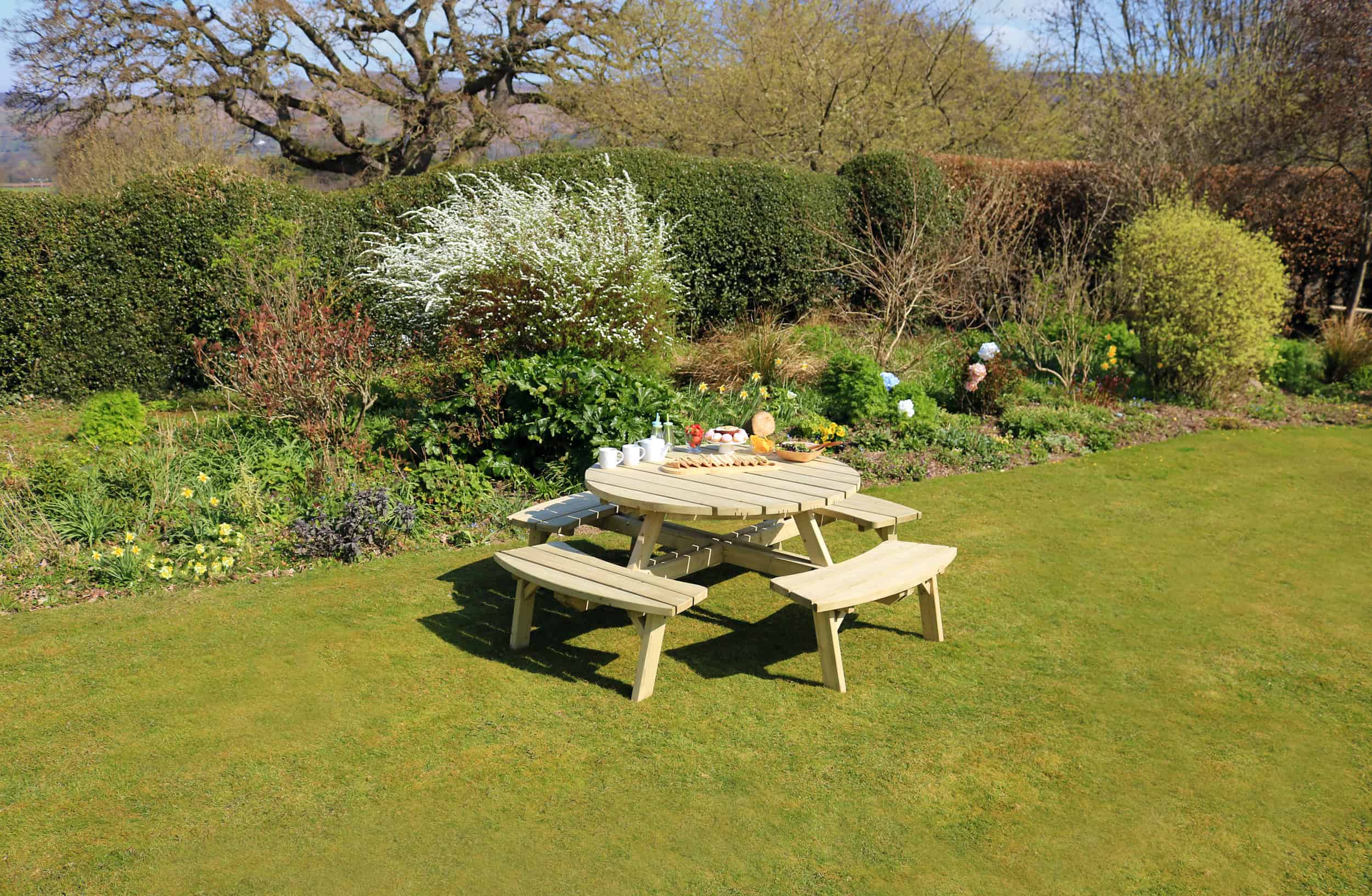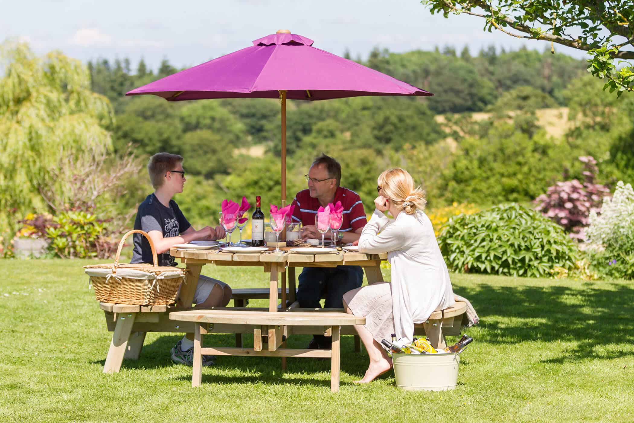 The Zest Rose Round Picnic Table is a stunning and social centerpiece for any patio or garden. Designed with four attached bench seats, it can comfortably accommodate up to eight people, making it perfect for family meals, barbecues, and gatherings with friends. The classic design is not only stylish but also highly practical, offering a durable and stable surface for dining. For added comfort on hot days, the 2.10m table top includes a 40mm parasol hole, allowing you to easily add shade.