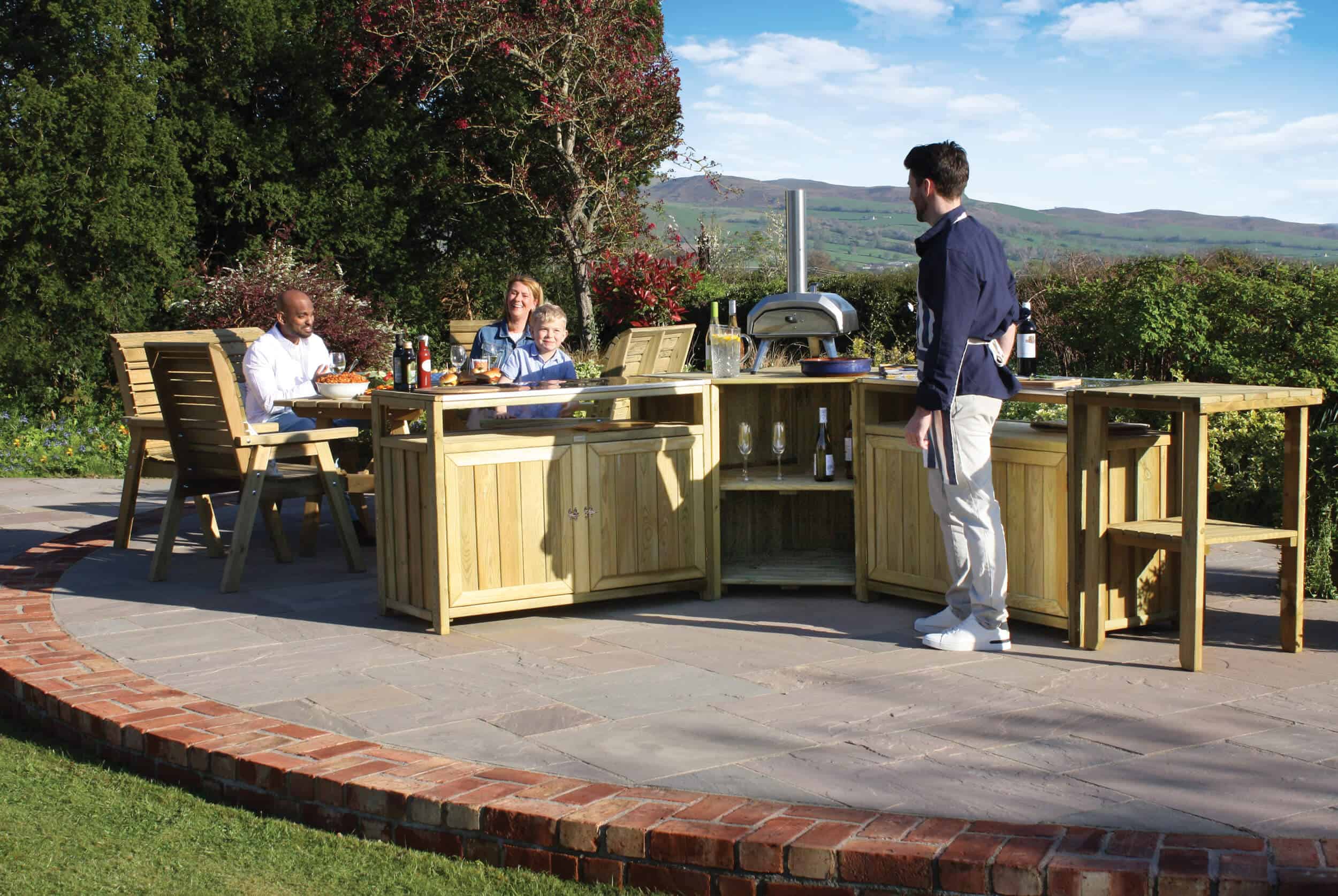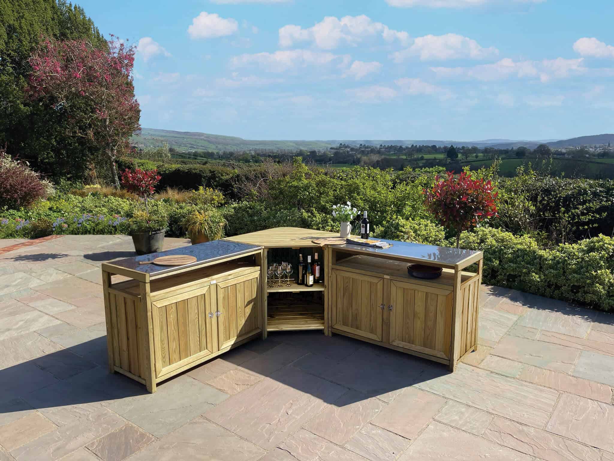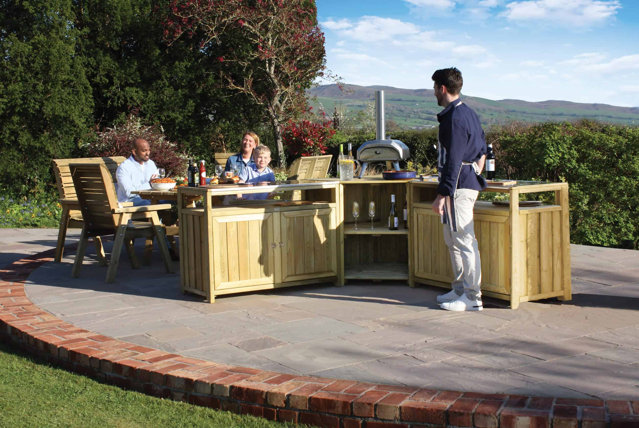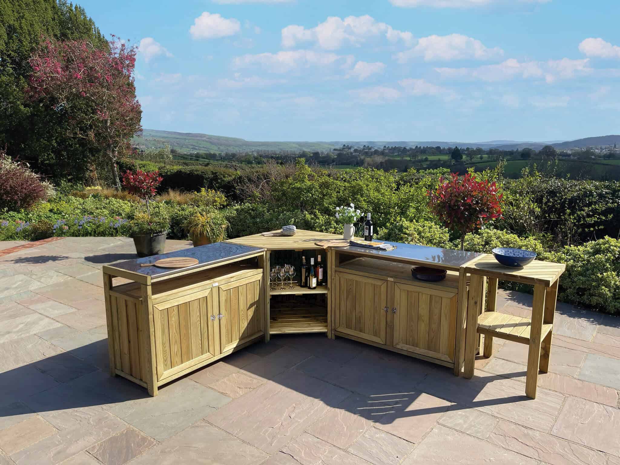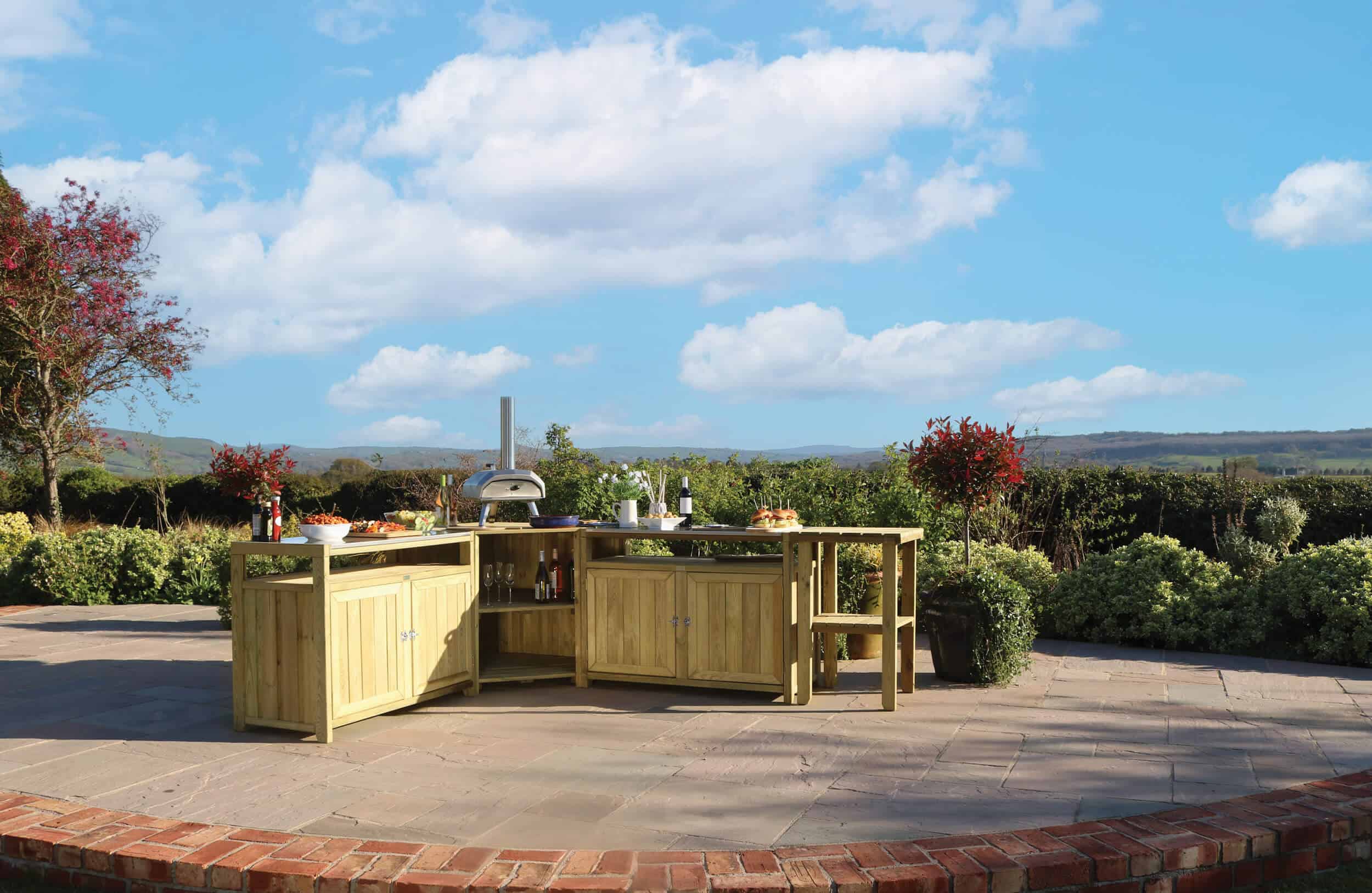Absolutely on trend for outdoor entertaining, the Zest Terraza Outdoor Kitchen provides a stunning and sustainable solution for alfresco cooking. Its natural wood finish blends beautifully into any garden setting, while its sturdy construction offers a reliable space for all your culinary needs. The collection can be purchased as a set, which includes two double units and a corner display unit, or each unit can be bought individually for a modular design that fits your space perfectly. An optional side table is also available to extend your serving space.